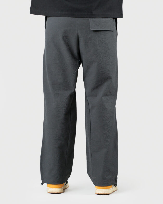 An adjustable drawstring waistband ensures a personalised fit, while drawstrings at the hem allow the piece to shift form—worn straight or cinched into a jogger. Subtle internal paneling adds depth to the construction, creating a minimal yet considered structure.