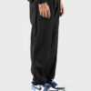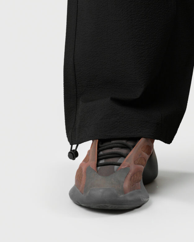 An adjustable drawstring waistband ensures a personalised fit, while drawstrings at the hem allow the piece to shift form—worn straight or cinched into a jogger. Subtle internal paneling adds depth to the construction, creating a minimal yet considered structure.